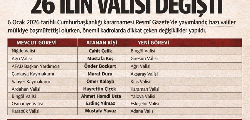 Cumhurbaşkanı Recep Tayyip Erdoğan’ın imzasıyla yayımlanan 6 Ocak 2026 tarihli ve 2026/1 sayılı Cumhurbaşkanlığı Kararnamesi, Resmî Gazete’de yayımlanarak yürürlüğe girdi. Kararnameyle Türkiye genelinde çok sayıda vali, vali yardımcısı ve üst düzey mülki idare amirinin görev yeri değiştirildi.